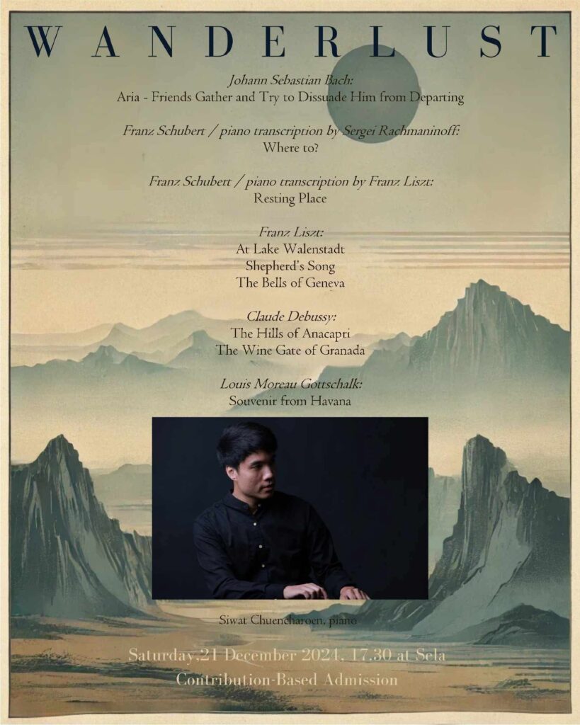 Last December, Sela hosted its Year-End Classical Concert, “Wanderlust,” a musical journey performed by pianist, Siwat Cheuncharoen. The concert traversed diverse landscapes and emotions through the works of renowned classical composers, encapsulating the essence of travel, longing, and the profound connection between music and place.
